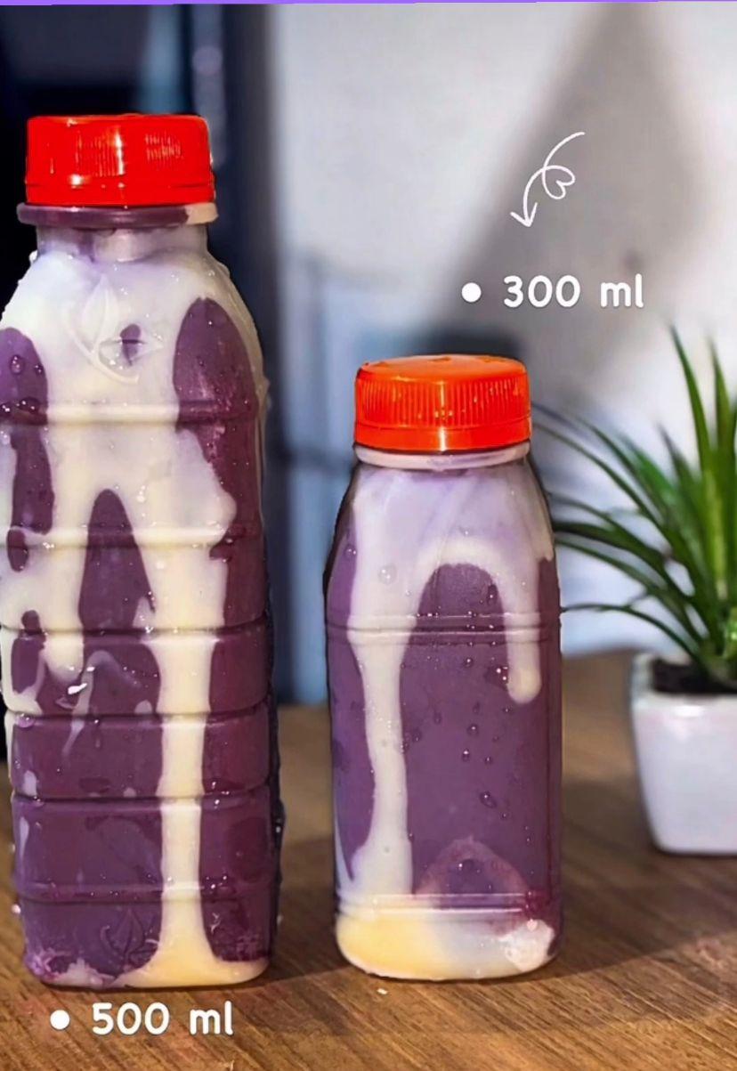 Temos açaí na garrafa de (300 ml, 500 ml ). É uma sobremesa cremosa e gelada, preparada com açaí batido e leite para obter uma consistência semelhante à de um milkshake.